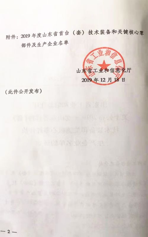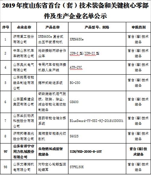 公司纳入山东省首台套生产企业名单